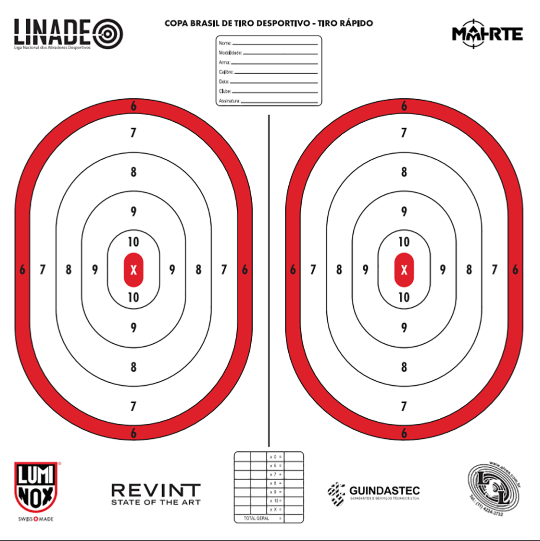 Descrição: ALVO CAMPEONATO NACIONAL DE TIRO RÁPIDO DESPORTIVO Dimensões: 55×55 Pacote com 100 unidades